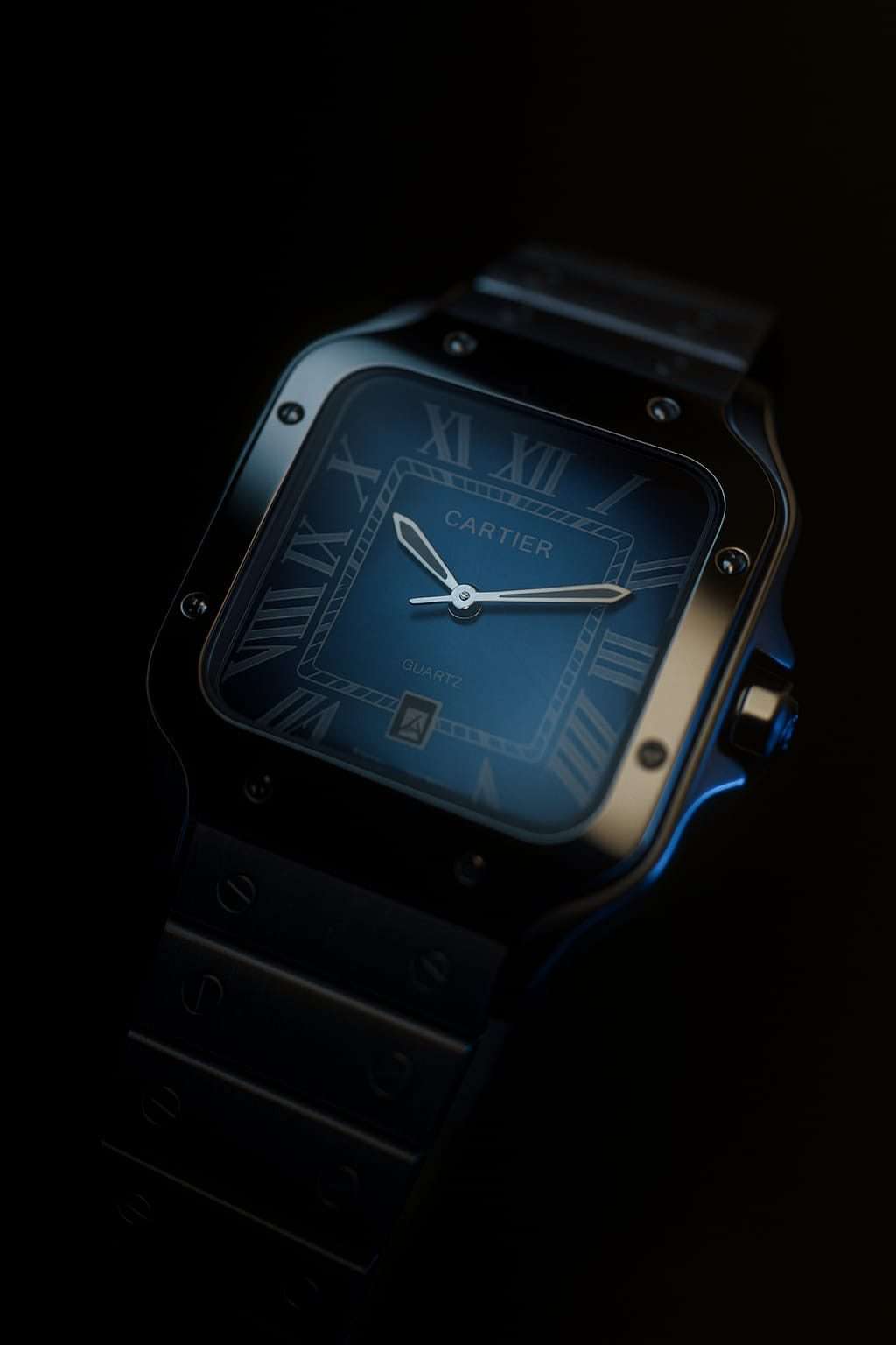 The watch features a polished stainless steel case with a squared bezel secured by signature screws, offering a blend of strength and refinement. Its dial displays Cartier’s hallmark Roman numerals in crisp silver, with sword-shaped hands for precise readability. The striking contrast of the midnight blue dial against the black-toned case and bracelet elevates its bold character, making it ideal for both formal and stylish casual wear.